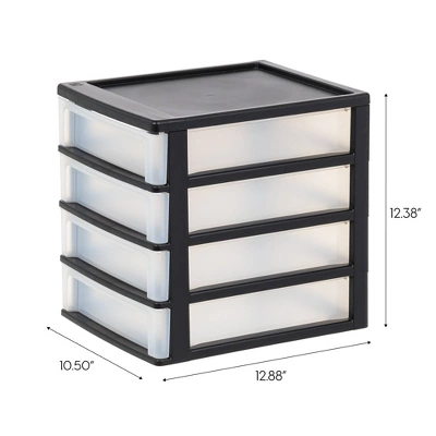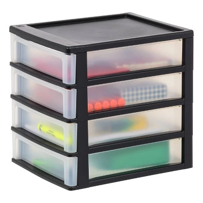 The IRIS Desktop Drawer Organizer are compact and convenient, the 4 drawer desktop units maximizes storage space throughout your home, office, bathroom and more. The small plastic drawers are durable and feature smooth glide drawers give you easy access to the contents inside. The indented top is perfect for storing additional supplies or displaying small pictures. The storage drawers are great for everything from accessories, makeup, tool, small bathroom supplies, and more. These compact drawer is the perfect way to make the most of a cluttered space.
