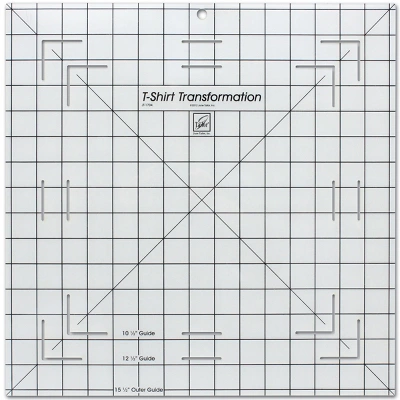 JUNE TAILOR-T Shirt Transformation Ruler. Center, mark and cut perfect t-shirt blocks for quilts, pillows and tote bags. It has three guides sizes to accommodate a wide variety of t-shirt sizes and graphics. Use any combination of 10, 12 and 15 inch for square or rectangle blocks. This package contains one 15-1/2x15x1/2 inch ruler. Made in USA. WARNING: Cancer and Reproductive harm. For more information go to www.P65Warnings.ca.gov.