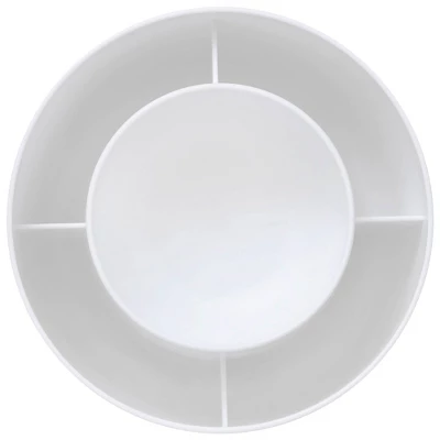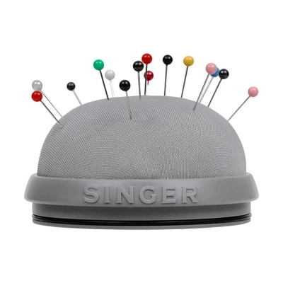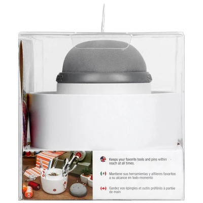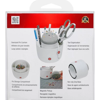 The SINGER Pin & Tool Caddy is a sturdy and convenient sewing supplies and craft organizer with easy-to-access storage space. Measuring 5.25โ in diameter and standing 5.25โ high, this desktop sewing supplies organizer easily fits on a sewing machine console, desk, counter, table, or any flat surface to organize an assortment of sewing notions and tools. The storage caddy itself is constructed from durable white hard plastic, and its base features a non-slip grip for extra stability. The oversized light gray built-in pin cushion attaches to the caddy and acts as a lid for the middle storage compartment designed for easy access to smaller notions like pins and safety pins. On the underside of the pin cushion is a low strength magnet that makes gathering light weight notions like loose needles and pins a breeze. Surrounding the round middle compartment are four open deep storage sections, perfect for stashing all tall sewing supplies from cutting instruments to sewing aids.