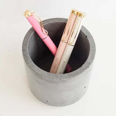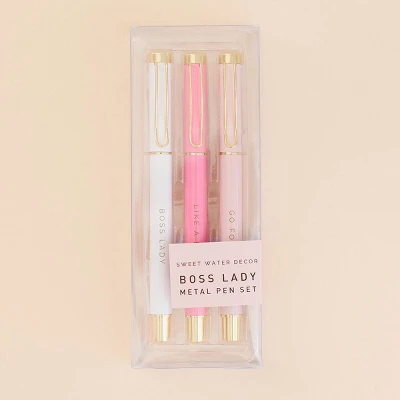 - Set of 3 metal pens with cap to give you motivation throughout the day! Perfect for every bosslady as a gift for her birthday, boss’s day, coworkers promotion, to give encouragement and positivity to a friend, on your desk at work, for a teacher, business gift, graduation and more. Every female boss needs positive encouragement and pretty cute pens to write with!