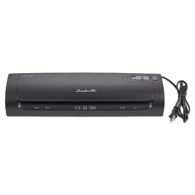 Keep business cards and a variety of other documents in great condition with this Swingline GBC Fusion 12-inch laminator. Get high-quality lamination results with this 12-inch laminator. To provide additional safety, the built-in shut-off feature prevents overheating when not in use, while the rounded corners help prevent snags and cuts. A green indicator lights up once the warm-up periods is completed, so you know exactly when you can begin lamination projects, and with a speed of 13 inches per minute, this machine ensures even large tasks are completed quickly. Pouches up to 3 mils thick work great, providing cards, tags, and documents strong protection against moisture, tearing, and wrinkling. The compact construction lets you store this laminator away in small spaces easily, and it doesn’t take up a lot of room when set up on a desktop or table. This Swingline GBC Fusion laminator is manufactured with plastic to provide durability, and the black color offers a professional appearance. Black thermal and cold laminator for use with laminating pouches to protect documents. Provides lamination with 5-minute warm-up time and laminating speed of 13″ per minute. 12″ wide throat supports input up to 12″ wide. Dimensions: 3.5″H x 4.13″W x 18.75″D. Auto shut-off saves energy and prevents overheating. Sold as 1 Each.
