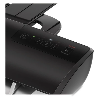 Get reliable protection for papers and cards with this Swingline GBC Fusion 3000L 12-inch laminator. Prevent essential documents from getting dirty, bent or damaged by water with this 12-inch laminator. With a warm-up time of only 1.5 minutes, this machine lets you get started on lamination tasks right away, and the compact design prevents it from taking up too much space on your desk. The built-in alert system beeps upon detecting a jam, letting you release and correct it with the press of a button. Handle large projects in a short space of time thanks to the lamination speed of 19 inches per minute. Power shuts off automatically after being idle for 30 minutes, helping save energy, and a green light indicator lets you know when you can begin inserting pouches. This Swingline GBC Fusion 3000L laminator can handle inserts measuring up to 12 inches wide, letting you protect business cards, large signs and a variety of other items. Black/silver thermal and cold laminator for use with laminating pouches to protect documents. Provides lamination with a 1.5-minute warm-up time and 19″ per minute laminating speed. 12″ wide throat supports input up to 12″ wide. Dimensions: 4.25″H x 5.75″W x 19.88″D. Intelligent Jam Alert system automatically detects a jammed or missed pouch. Auto shut-off saves energy and prevents overheating. Sold as 1 Each.
