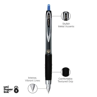 Write with crystal-clear precision by using this 12-pack of uni-ball 207 blue micro-point retractable gel pens. Stock your office, home or classroom with 207 Retractable Gel Pens from uniball featuring a 0.5mm micro point with a stainless steel tip that resists bending and breaking. Even-flowing, pigment-based gel ink delivers a smooth writing experience for intense, vibrant lines, ensuring that every mark is brilliantly communicated. Use these retractable gel pens for everyday writing tasks, check signing and all of your important signatures, trusting its quick-drying uni Super Ink. Innovative uni Super Ink technology effectively entraps the gel ink into the paper, producing fraud, fade and water-resistant documents that resist check washing or bleaching. The 0.5mm micro point produces neat and precise strokes for detailed writing and drawing. A textured grip offers greater comfort and control as you continue writing, while a translucent ink window indicates the level of gel ink remaining, so you don’t run out unexpectedly. The sleek design of the 207 with modern metal accents gives the retractable gel pen a stylish touch. The fine 0.5mm micro point produces outstanding readability and detail. Water and fade-resistant gel ink helps you compose long-lasting, high-quality documents you can archive. uni Super Ink entraps the gel ink in the paper, creating a strong bond that resists document fraud. A textured rubber grip ensures ease of writing while helping you maintain good control; convenient clip ensures that your favorite gel pen is always at hand. Professional’s first choice gel pen with stylish metallic accents and a high-quality finish. Comfort grip for superior control. Features a pocket clip for convenient carrying. Gel pens feature smooth-flowing pigment-based ink with vibrant color. Sold as 1 Dozen.