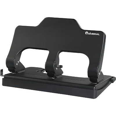 Patented Power Assist technology punches through stacks of paper with 56% less force. Adjustable width guide for perfect hole alignment from stack to stack. Locking lever mechanism for safety and space-saving convenience. Bottom tray catches hole chips and flips open for easy disposal. Sheet Capacity: 30; Operating Method: Manual; Number of Holes: 3; Hole Diameter: 7 mm. Punch through stacks of paper easily. Punches up to 30 sheets of 20 lb. paper. Three holes. Removable chip tray. Metal. Black. Sold as 1 Each.