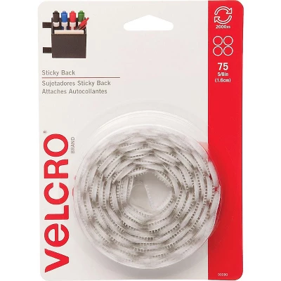 Maintain a tidy and organized space with these Velcro white sticky back coins. Keep small items from cluttering your workspace using these sticky back coins. The round shape is ideal for organizing items that clutter your desk by sticking them on smooth surfaces. These Velcro sticky back coins use woven technology and can be refastened up to 1,000 times. Sticky-back hook and loop fasteners. Round 0.63″”Dia. fasteners. 75 white fasteners per set. Adheres to smooth surfaces for everyday indoor use. Sold as 75/Pack.