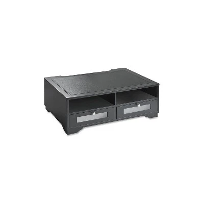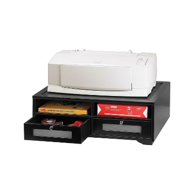 Part of the Midnight Black Collection, this printer stand brings a fresh perspective to desk accessories by offering functional solutions with appealing design elements. Two shelves accommodate paper reams or folders. Two drawers can be placed in any of the four locations providing flexible storage for printer supplies. Rear access space helps manage cables and allows a flush positioning against the wall. Sturdy 18.9 lb. wood construction features a durable, double-coated matte black finish. Brushed metal handles, faux leather top and frosted glass windows add a touch of class. Nonslip rubber feet reduce movement and protect your work surface from scratches and scuffs. Large 21-3/4″ x 15-1/4″ x 7-3/45″ design holds desktop printers, monitors, fax, postage, or other office machines. Perfect for use either at home or in the office. Wood Printer Stand. 21-4/5″”x15″”x7-4/5″”. Midnight Black. Four compartments. Two large drawers with frosted glass windows for printer supplies can be placed in any of four locations providing flexible storage. Rear access space manages cables and allows flush positioning against wall. Sold as 1 Each.